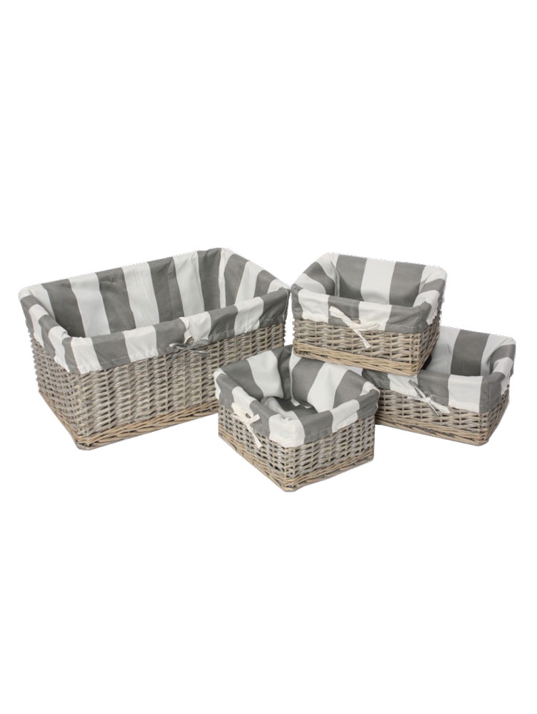 Set 4 cosuri din salcie, cu interiorul din material textil in dungi albe si crem. Aceste cosuri sunt ideale pentru depozitarea articolelor vestimentare sau altor maruntisuri din casa. Latime: 33 cm. Lungime: 50 cm. Inaltime: 24 cm. Pret: 196,99 lei.