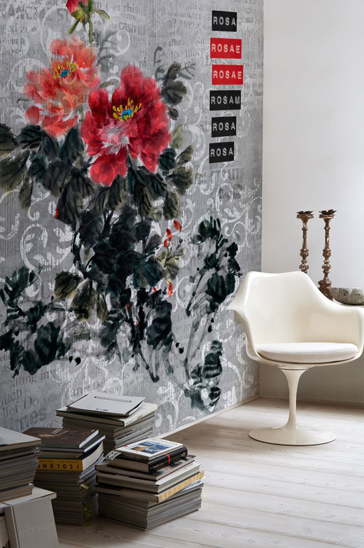 Tapet Rosa Rosae, cu tematica florala; design semnat Christian Benini. Disponibil in doua variante cromatice: rosu si albastru, pe fundal gri. Latime rola: 47 cm. Pret la cerere