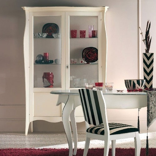 Vitrina eleganta cu doua usi - 716/G. Dimensiuni: 130x50x200 cm. Lemnul de plop, rezistent si totodata usor de prelucrat pentru a capata viata, poate fi finisat in mai multe variante de culori. Poti opta pentru placare cu foita de aur sau argint, sau pentru pictura manuala, iar feroneria ii va urma linia pentru a intregi ambientul spatiului tau personal. Pret: 6.605 lei.