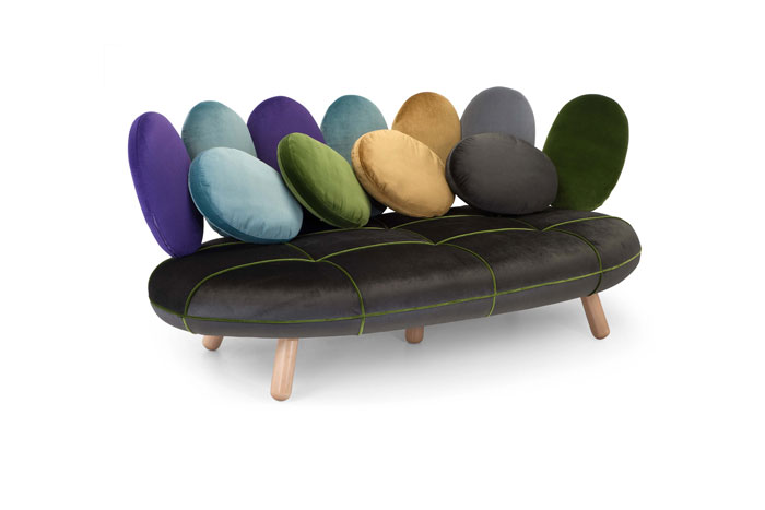 Jelly - canapea de 3 locuri cu design orginal, ce captiveaza prin linia neconventionala si combinatiile cromatice avangardiste. Structura si picioare din lemn si tapiserie textila sau din piele, disponibila intr-o gama variata de culori si modele. Sezut din spuma poliuretanica de mare densitate. Dimensiuni: 200 x 96 x 90 cm. Pret la cerere