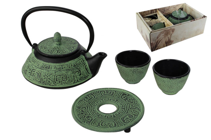 Set 4 piese vintage din metal: ceainic verde, 2 pahare, suport pentru ceainic. Pret: 223 lei.