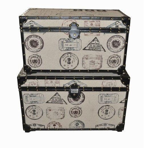 Set 2 cutii - Panza cu imprimeu stampila. Clipsuri inchidere din piele ecologica. Finisaj interior MDF si lemn de brad.L 70,5. H 40,5. A 36,5 cm. L 78,5. H 47,5. A 40,5 cm.Pret: 399 lei.