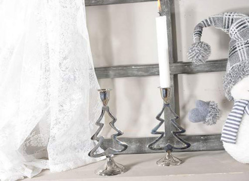 Set sfesnice argintii in forma de brad, din metal. Dimensiuni: Mare: 9.5x7x17,5 cm. Mic : 8.3x5.8 x17 cm. Diametru lumanare 2 cm. Pret: 120 lei.