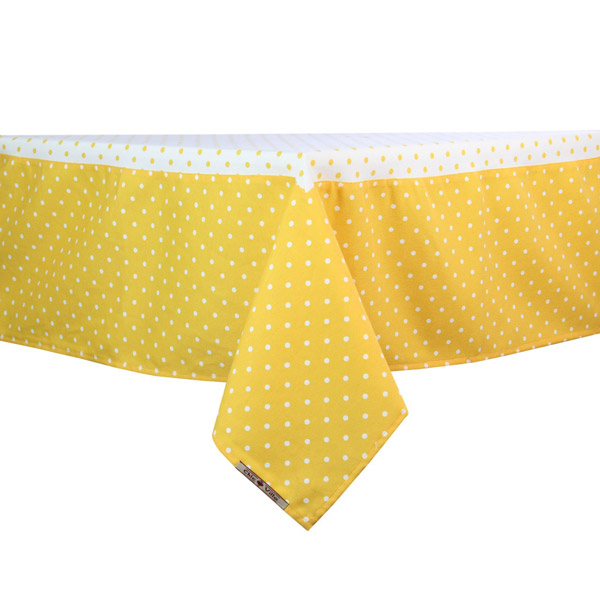 Fata de masa din textil alb cu galben cu buline 140x140 cm. 80% bumbac. Pret: 99 lei.