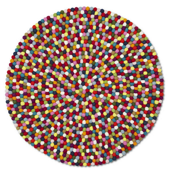 Pinocchio Ø 140 cm - Hay. Sute de bile din lana cusute impreuna creeaza o suprafata calma, opaca, peste care se se suprapun imprimeuri geometrice colorate, pline de viata. Rezultatul: o gama de covoare pentru interioare cu iz proaspat, contemporan. Pret: 3.280 lei.