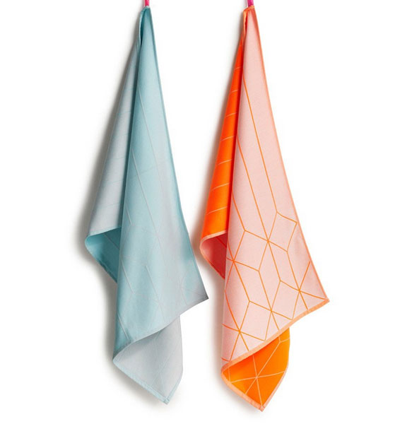 Tea Towels set de 2 - Cold Forest, Box, Gradient, Kitchen Tiles si Hanging Grid, toate acestea sunt numele prosoapelor din colectia Tea Towels realizata de Scholten & Baijings pentru brandul Hay. Folosirea culorilor neon este o caracterstica specifica designerilor mai sus precizati. Design: Scholten & Baijings.Prosoapele sunt dintr-un mix de bumbac si poliester si vin in set de cate doua. Dimensiuni: 52x75 cm. Pret: la cerere.