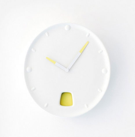 Guichet - De la prima vedere, Guichet pare un ceas special, iesit din tipare. Primul lucru care il da de gol este forma ovala, destul de inabordabila atunci cand vine vorba de ceasuri de perete. Ei bine, designerul Inga Sempe s-a gandit sa ii ofere si un substrat poetic. Acea mica ferestruica ce inlocuieste cifra 6 si prin care poti vedea pendulul, serveste drept dovada ca timpul trece cu repeziciune. Pret: 745 lei.