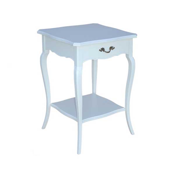 Consola alba cu sertar Amelie - Dimensiuni: 52x52x78 cm. Finisaj la alegere. Material: lemn masiv de brad. Feronerie din alama patinata; sertar cu sina de lemn. Pret: 1.083 lei.