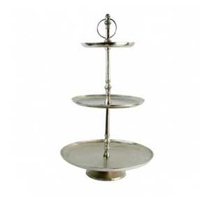 Tava etajata Elegance, din metal argintiu. Diametru: 43 cm, inaltime 73 cm. Minunat obiect de decorat si de indragit, tava etajata din metal argintiu este un element ce va purta cate si mai cate, toate pentru a crea un decor special. Fie ca poarta fructe, mici delicii cu care sa-ti surprinzi invitatii, decoratiuni de sezon sau aranjamente roiale cu flori si lumanari, tava etajata va fi suportul milioanelor de idei de amenajare, fiind acea piesa de baza care va aduce eleganta si stralucire in fiecare clipa. Pret: 490 lei.
