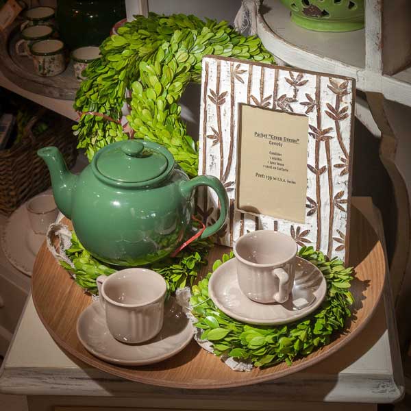 Pachet cadou Green Dream - Material: ceramica. Setul contine: o tava, un ceainic si doua cesti cu farfuriute. Pret: 139 lei.