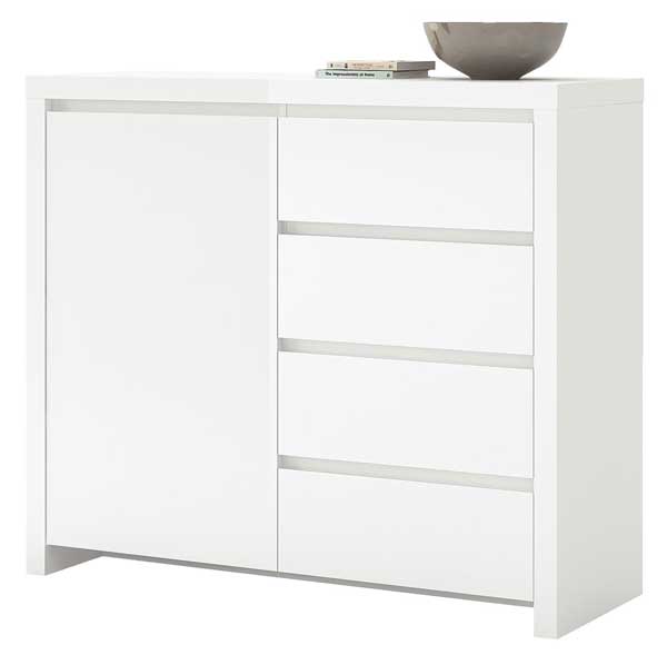 Lario - Comoda. Culoare: alb lucios. Material: MDF. Dimensiuni: ca. L/H/A: 113/97/40 cm. Corp alb lucios, front:alb lucios, 1 usa , 4 sertare. Pret: 999 lei.