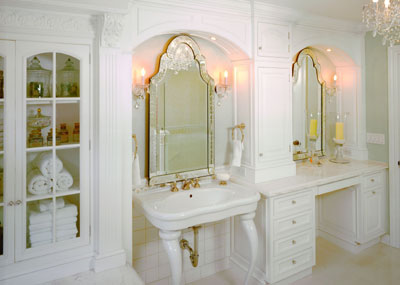 O baie cocheta cu mobilier din lemn, in care predomina albul si auriul. Designul este luxos.