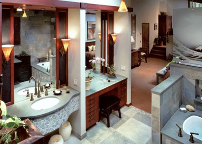 Designul acestei bai este inspirat de natura, fiind prezente toate cele 5 elemente creatoare: metalul, focul (instalatiile de lumina sunt galben-portocalii), apa (sunt prezente doua surse de apa), lemnul (mobilierul) si pamantul (culoarea mobilierului).