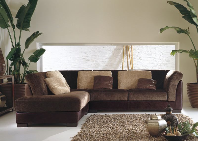 Corpurile cu nuante naturale, combinatia lemn, ceramica si piele, mai ales cand aceasta are nuante pamantii, creeaza un mediu calm si calduros. Gran Feria: canapea mix piele/stofa Bora, design Juanes. Pret: 3.449 euro fara TVA