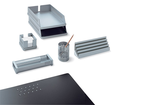 Babele - O colectie unica pentru un birou fara varsta; Babele ofera un design contemporan si elegant. Piesele colectiei sunt disponibile in varianta neagra, aluminiu, rosu, albastru, gri. Colectia include: tava pentru hartii, se completeaza cu un pad de birou, tava pentru creioane, cupa creion, suport memo pad şi suport hartii. Dimensiuni: 25,5x35x7 cm - suport hartii, 27,5x9x3,5 cm - suport creioane, Ø 8 x h 10 cm - cupa creioane, 11x11x7 cm - memo pad, 24x4,5x9,5 cm - suport hartii. Pret: 150 euro/ set. Produs in: Italia