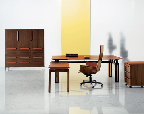 Mobilier de birou din colectia Passo Doble, realizat din lemn masiv, cu insertii de piele. Design Luca Scacchetti. Pret la cerere