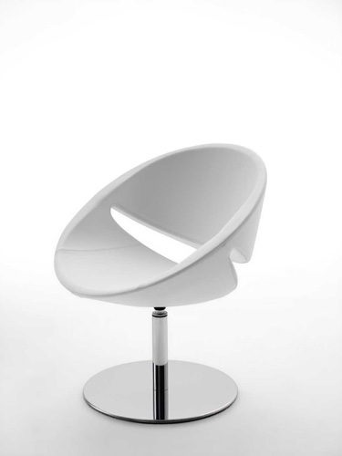Scaun Mya disponibil in trei variante: cu picioare stea, cu baza rotunda sau picioare stea cu rotile. Structura metalica tubulara, cu tapiserie din material textil sau piele. Pret de la 582 euro + TVA