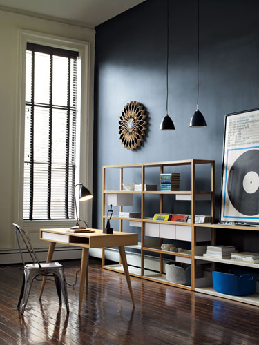 Depozitarea este importanta in orice spatiu, indiferent de functiunea sa. In birou, cu atat mai mult. Apeleaza la polite si cadre metalice ori din lemn, ca cel din imagine, pe care poti amplasa cosuri si cutii de depozitare. Iluminat este, insa, cel mai important. Foloseste lampi metalice, cu aspect industrial, iar spatiul tau de lucru va fi chic si in tendinte.